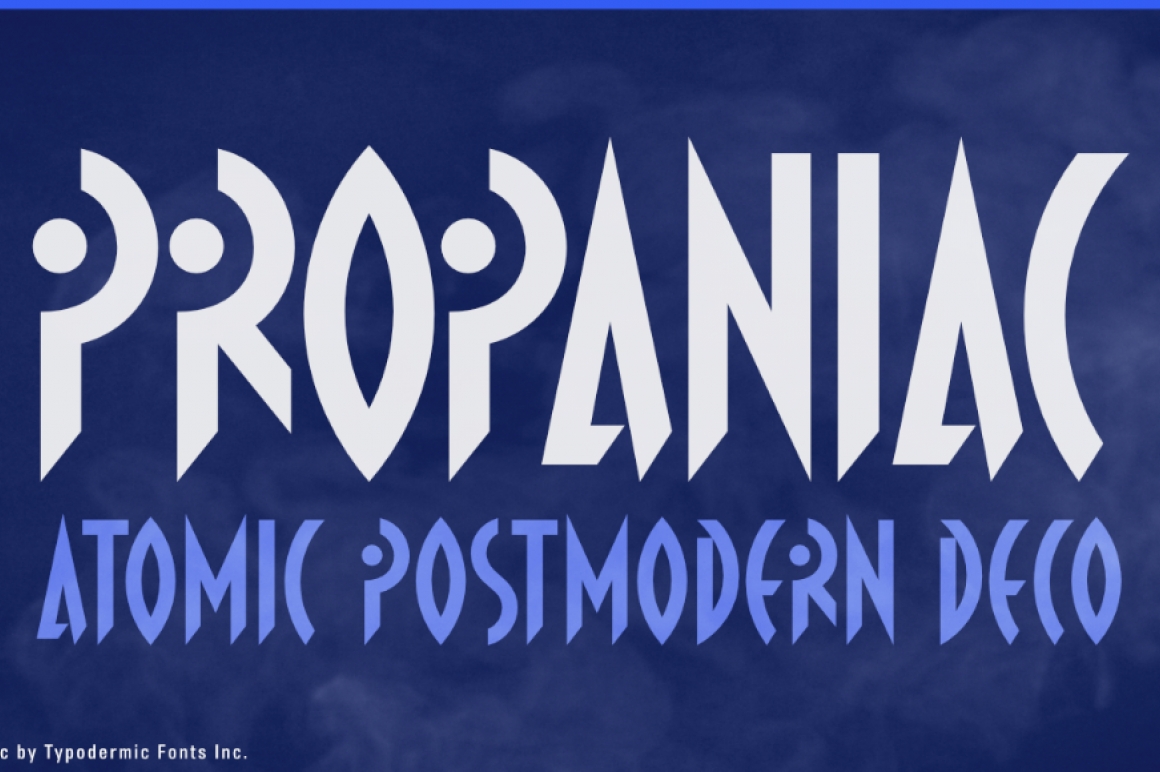 Propaniac is a 1980s-style postmodern typeface inspired by a Pointer Sisters record sleeve which was designed by Shoot That Tiger Creative Services. Almost all current Latin based languages are supported, including Vietnamese, Cyrillic languages and Greek.