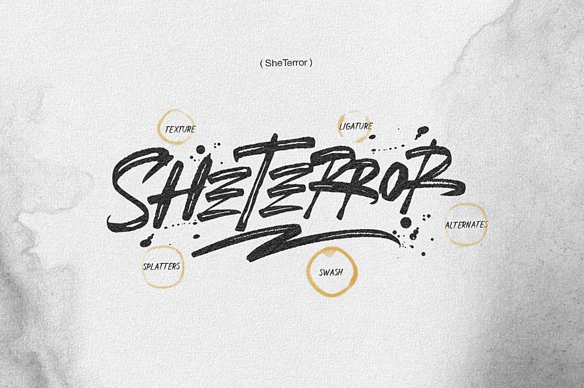 he SheTerror is a striking display font. It was inspired by the cola pen. Its raw energy can instantly transform any graphic design project in to a bold statement.