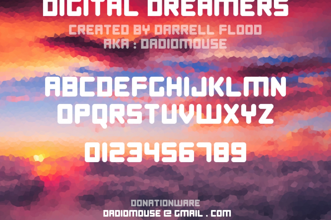 "Digital Dreamers", created using Fontstruct & High Logic FontCreator by Darrell Flood, is free to use for personal use.
