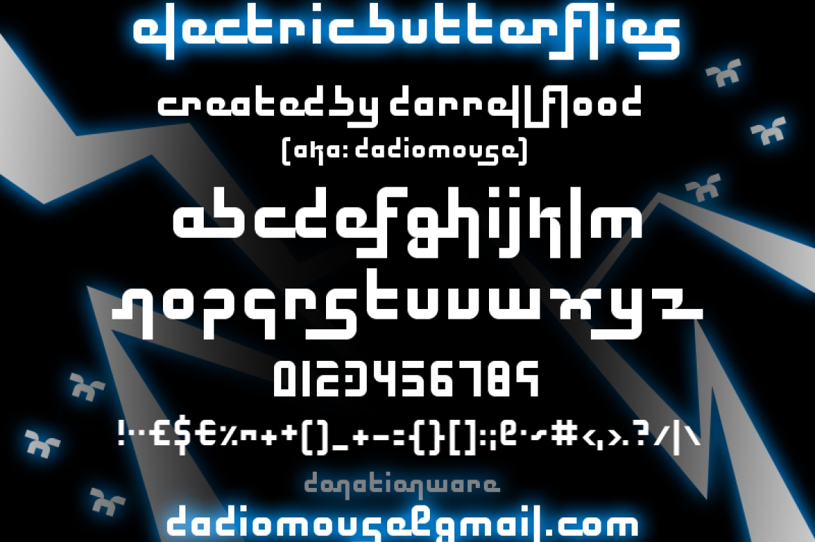 "Electric Butterflies", created using Fontstruct & High-Logic FontCreator, is a Donationware font.