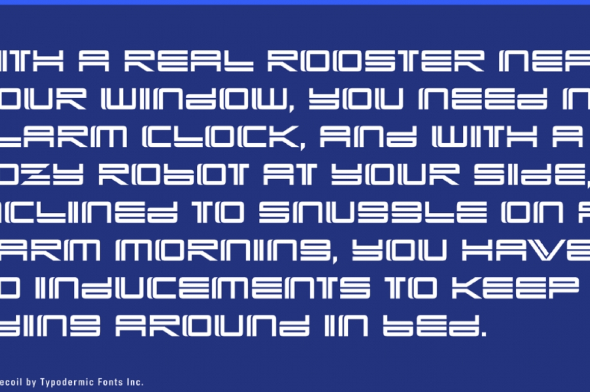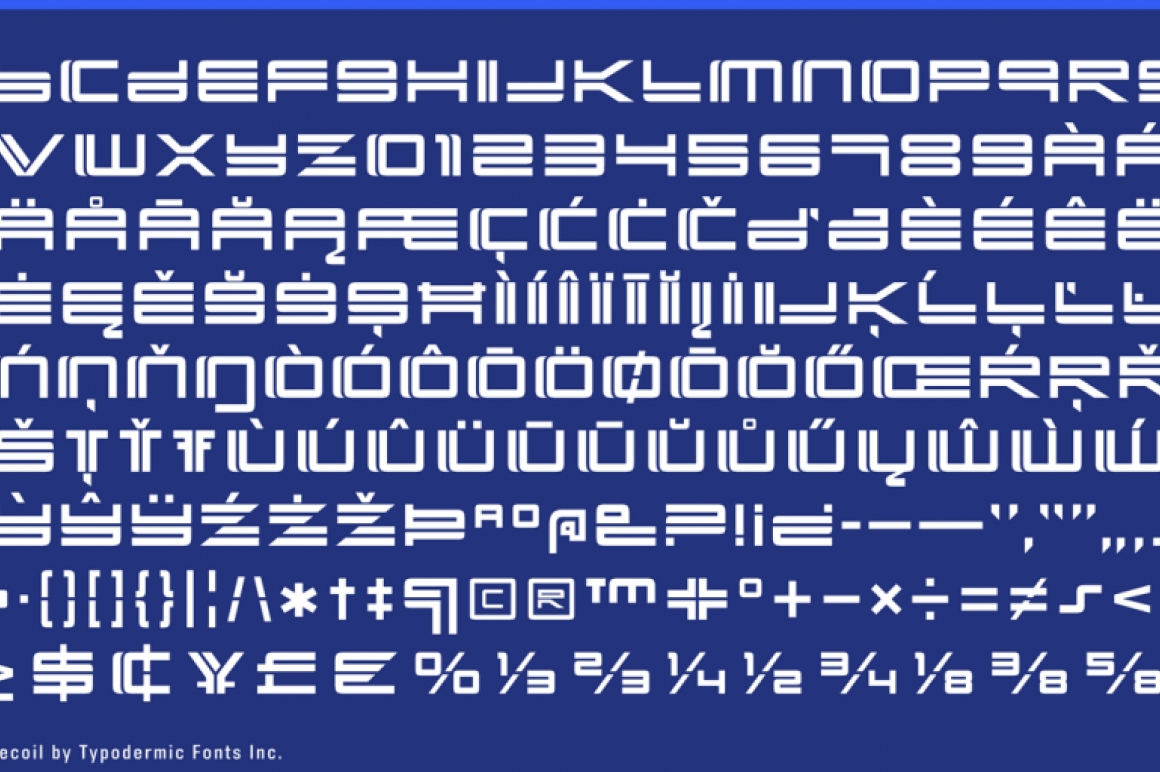 Yonder Recoil is a twin-line techno font I made in 1997. I recently redrew it with more precision and a more interesting vertical split on some letters.