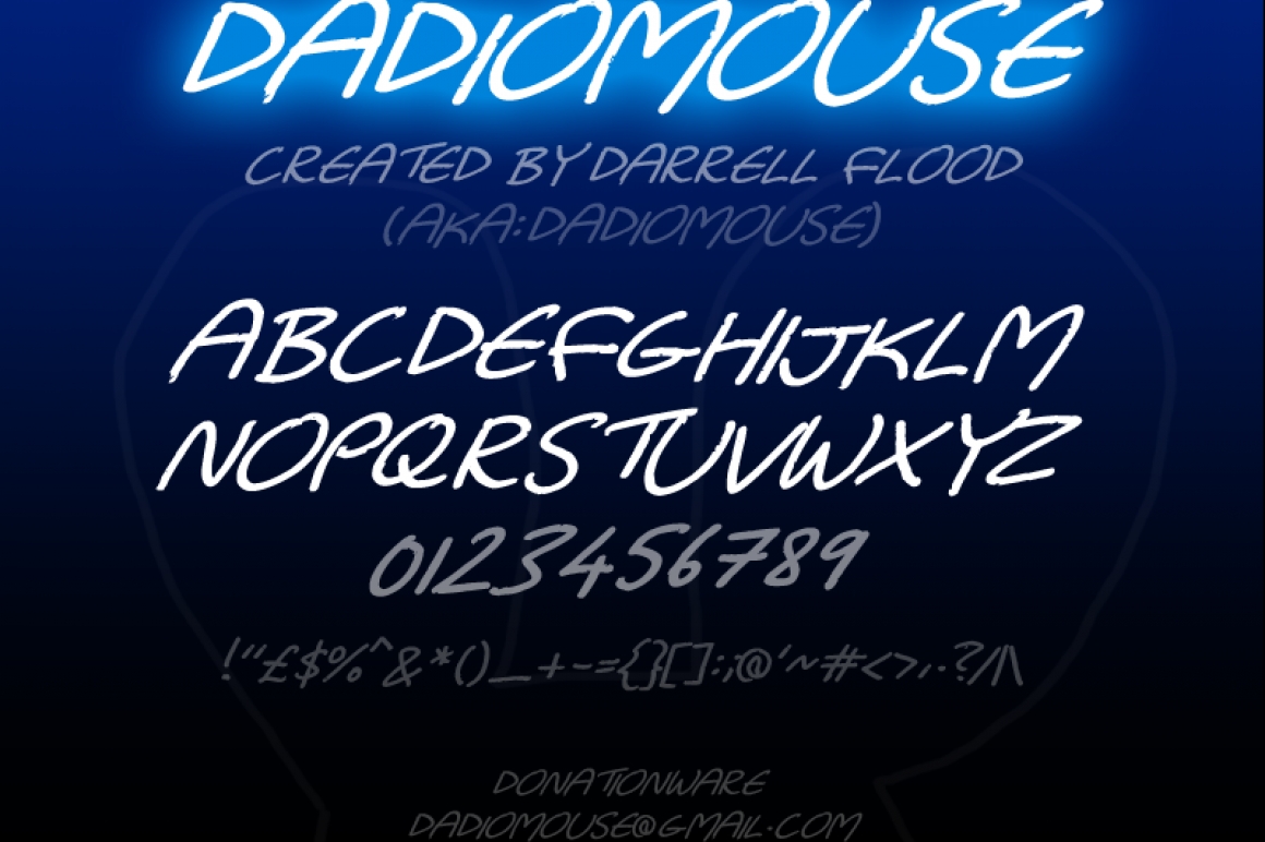 "Dadiomouse", created using High Logic Scanahand & edited in High Logic FontCreator by Darrell Flood, is free to use for personal use.