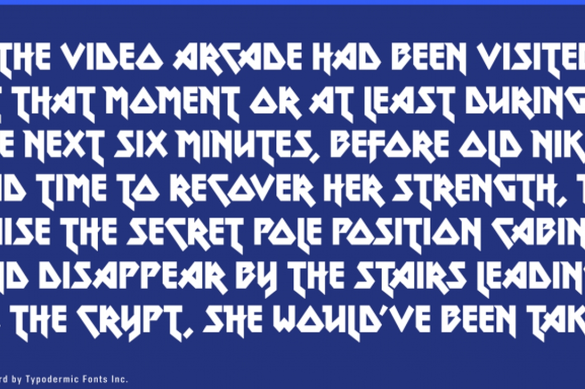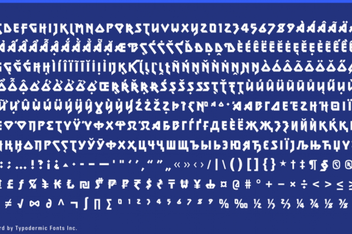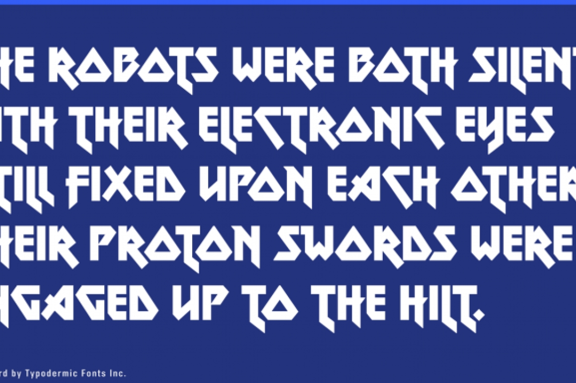 Please read the following description using your internal monologue with an echo effect. Metal Lord is a an angular metal font created in 1996. Metal Lord has been completely redrawn, spaced and kerned. It’s a bit heavier than it used to be and thanks to the discovery of additional reference material is has a slightly different design. The original version of Metal Lord was loosely extrapolated from the letters in the Iron Maiden logo using the powers of imagination . . . and the powers of Satan. You hardcore Maiden fans may recognize some of the letters from their late 1980’s official calendars. I later discovered that same font was used in 1976 for the poster for David Bowie film, The Man who Fell to Earth as well as on a real estate paperback book cover from 1979. With these extra resources I was able to piece together a better representation of this font. I still haven’t been able to figure out who designed the original: if you find out please let me know. The last version contained a rather ridiculous lowercase script S which I spotted the 1988 calendar. I moved it out of the main set but you can still get at it if you want. In OpenType apps, you can select it using the ‘stylistic alternates’ feature but I don’t recommend it. If you use Metal Lord in an OpenType savvy application, you’ll see magic stuff going on: letters occasionally flip, tuck and grow little flags to fit nicely together, but not so much as to be distracting. I’ve added lots of punctuation, symbols, fractions and numeric ordinals, to the delight of high school teachers everywhere, I’m sure.