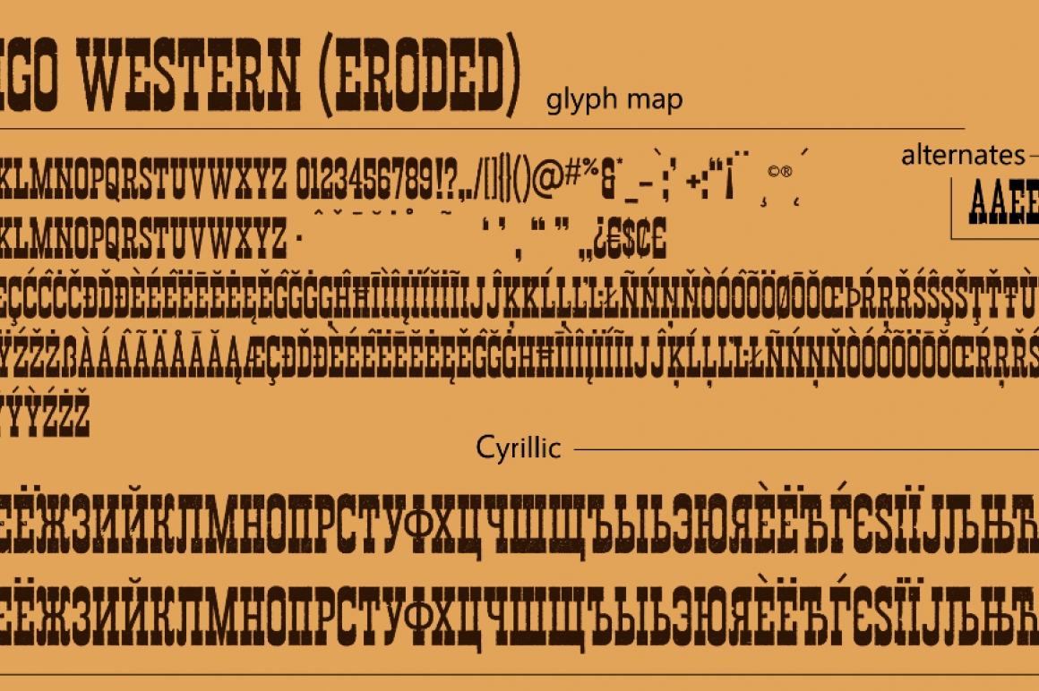 Basic/Extended Latin, European accents, punctuation, diacritics, kerning, and Cyrillic characters for Russian are included in the full version. The eroded version features 2 levels of distress between the uppercase/lowercase, contains a few alternates, and features less punctuation. Please check the glyph maps. The regular version does not contain alternates. Uppercase and lowercase are identical. The demo contains basic Latin and numbers only. The full version can be acquired for $25 for personal use only or purchase of a commercial license. Please visit www.sharkshock.net/license for info on commercial use. Please note that this 25$ does not constitute a license of any kind.