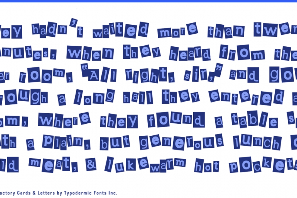 Earwig Factory is a jumbled alphabet mounted on weird little cards. This new version has more language coverage, more crazy-ass math symbols and the beloved new Indian rupee symbol. Also new: a pseudorandomized jumble effect in OpenType savvy applications to reduce the occurrence of identical letters. If you ever need to use Earwig Factory on something other that a white background, you now have the option of purchasing separate layers. The letters layer is even interesting on its own, without the background cards.