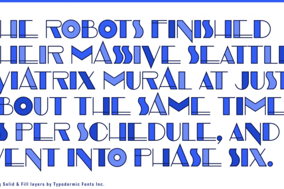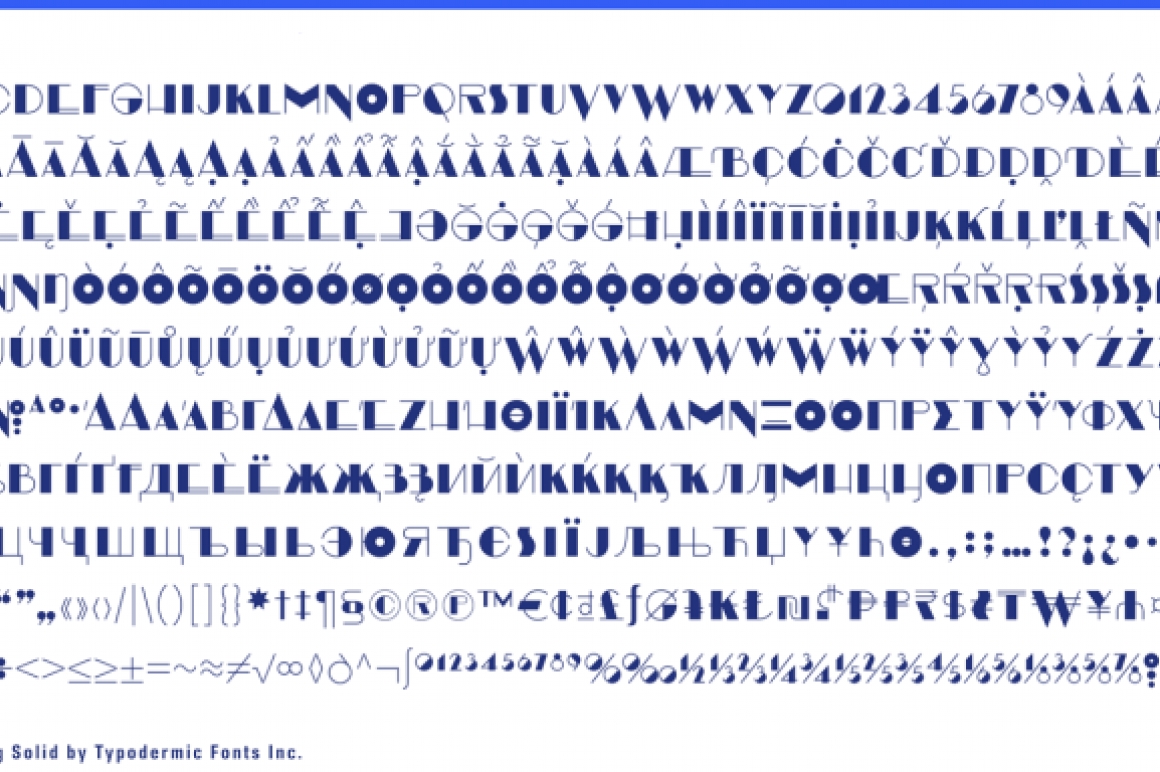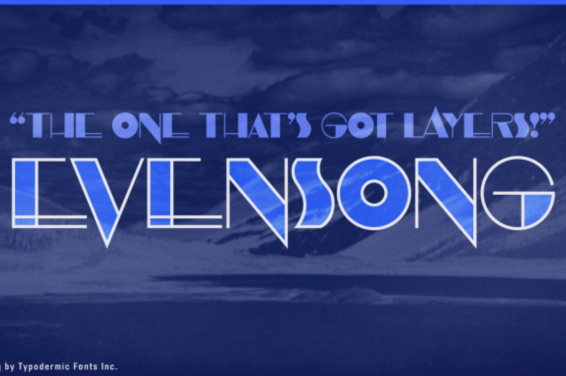 Evensong is a geometric deco typeface. You can use the Solid and Hollow styles on their own or layers of Solid and Fill. Evensong supports Greek, Vietnamese, Cyrillic and most Latin based languages. The desktop license for Evensong Hollow is free.