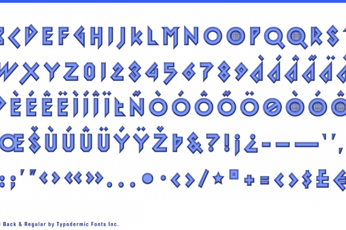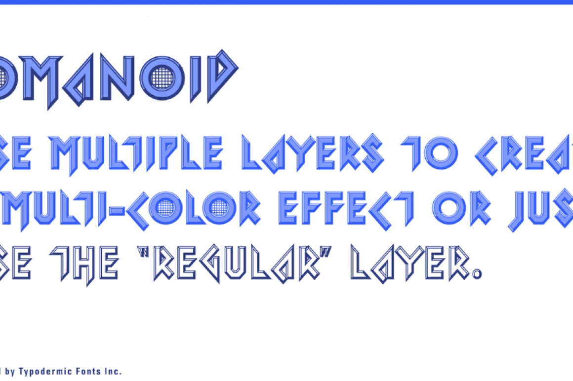 Iomanoid is a video game inspired, mid-1980’s techno font. Use the transparent regular style or stack the back, front and shine layers.