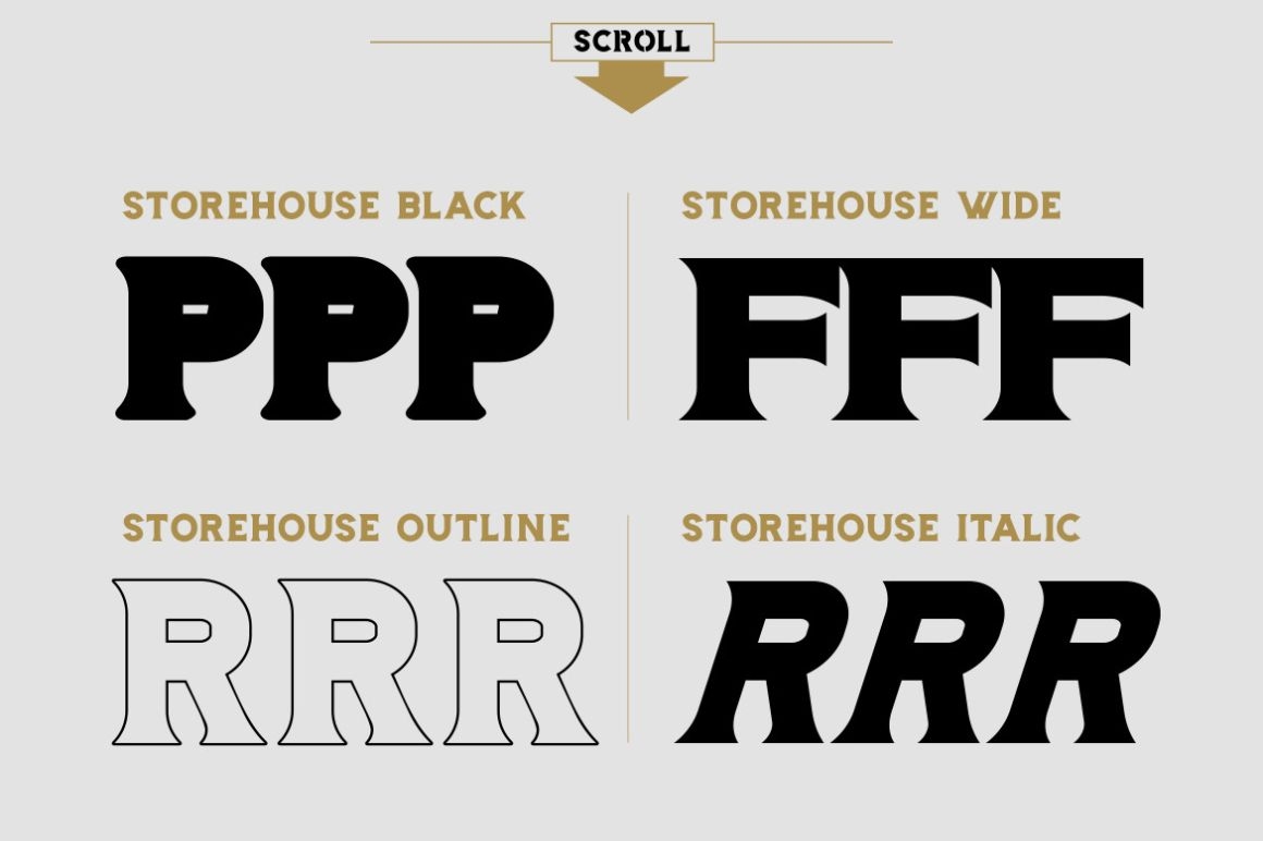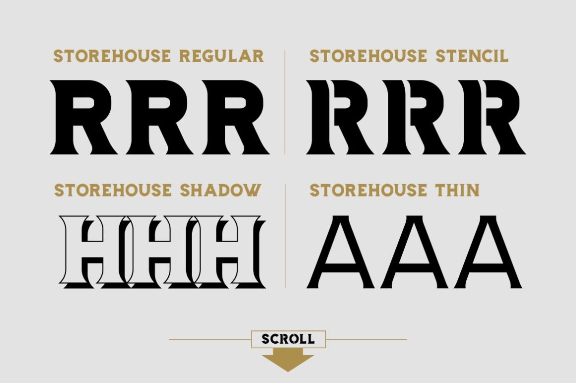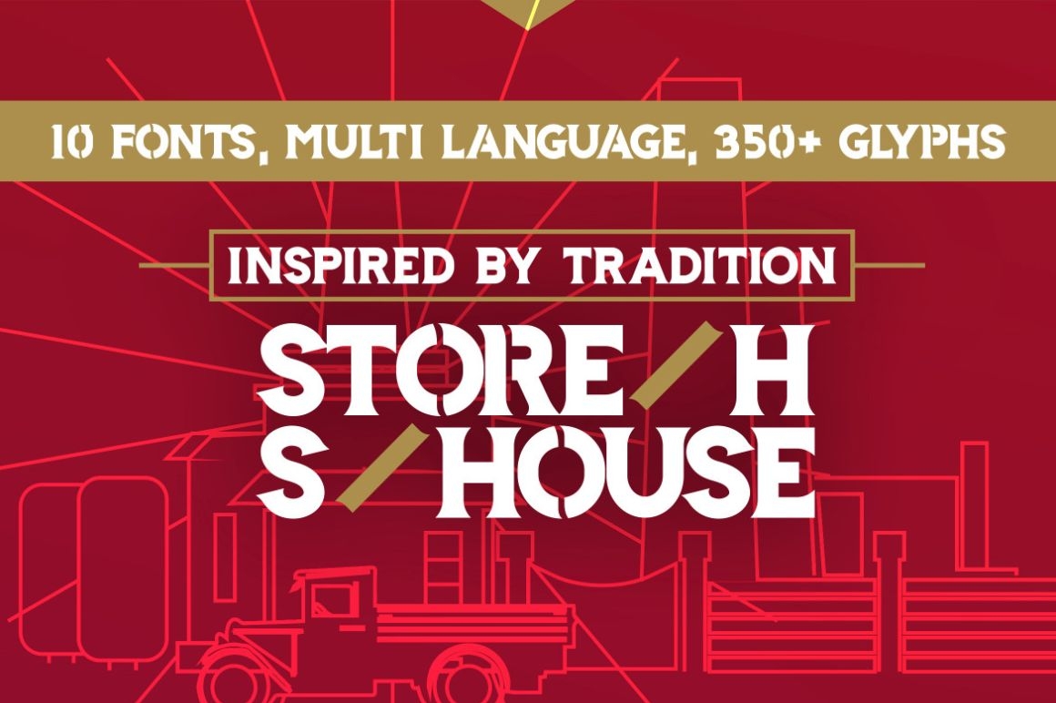 Storehouse Font is an old fashioned typeface with a modern touch. Inspired by tradition, hardworking brewers and 1800s it come up with 10 strong, confident and powerful styles, included: Regular, Italic, Thin, Black, Outline, Shadow, Used, Wide, Soft and Stencil.