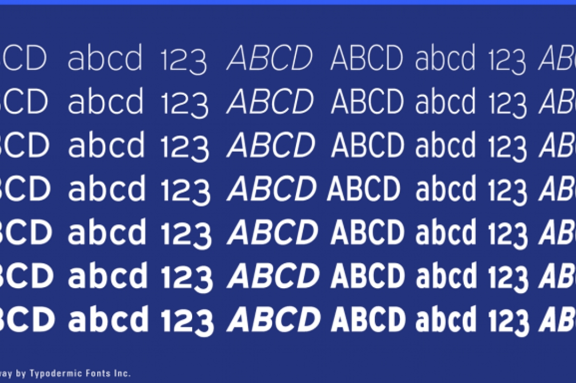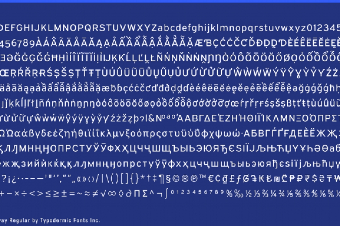 Rather than rigidly following government specs, Expressway is a more practical design that still holds on to that road sign feeling. The full family has 7 weights, 2 widths plus italics for a total of 28 styles.