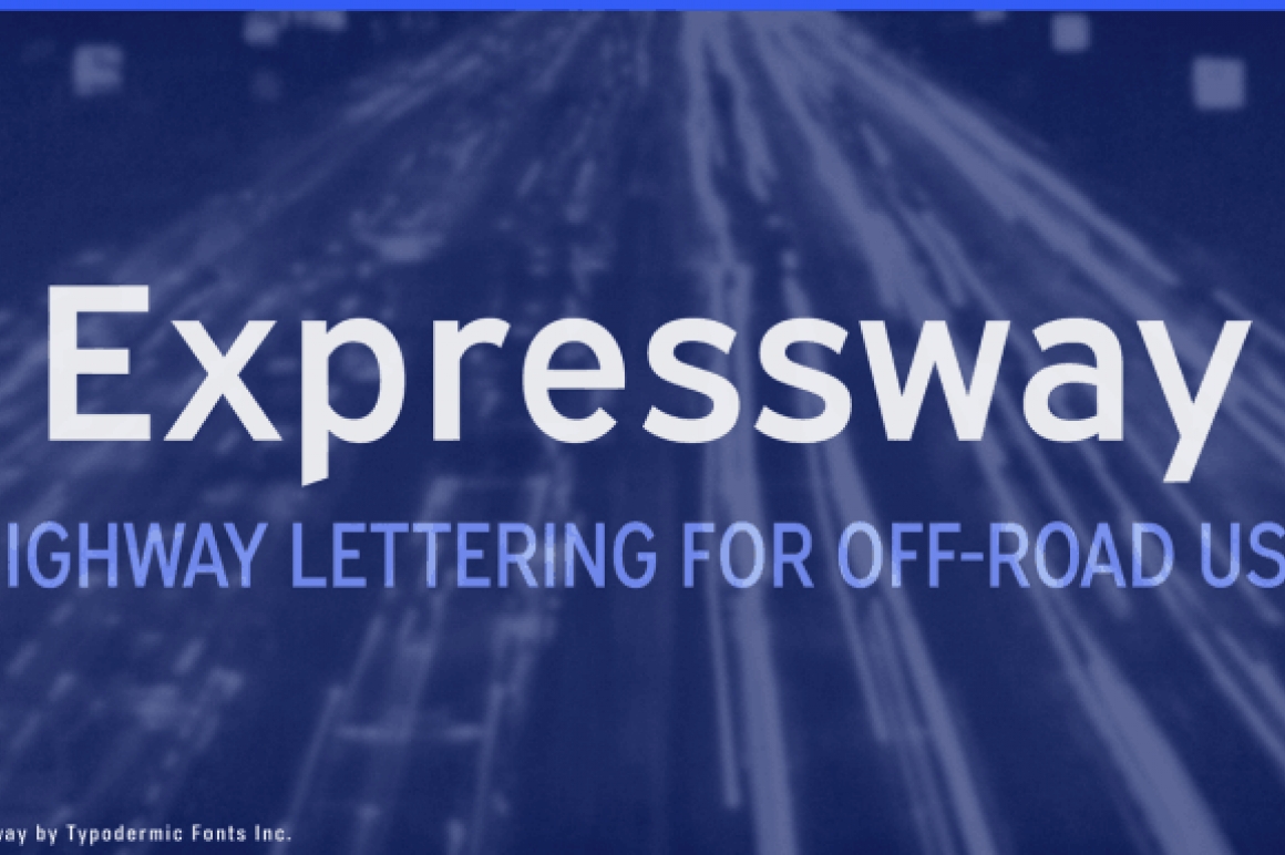 Expressway is a sans-serif font family inspired by the U.S. Department of Transportation’s FHWA Series of Standard Alphabets, also known as Highway Gothic. Since the middle of the twentieth Century, it’s the font most used on road signs in the United States, Canada, Mexico, Australia, Turkey, Spain, Venezuela, the Netherlands, Brazil, Argentina, Taiwan, Malaysia, Indonesia, India, Mongolia and New Zealand.