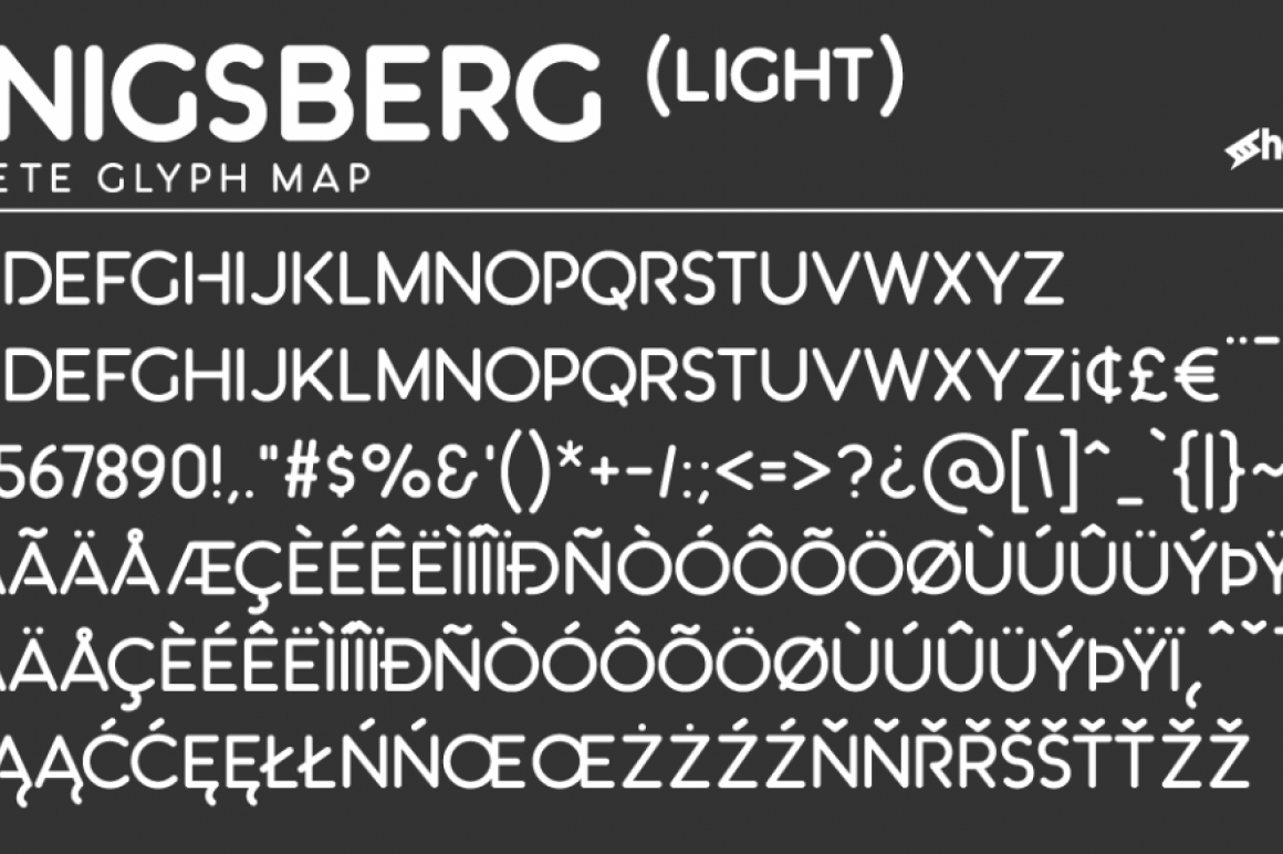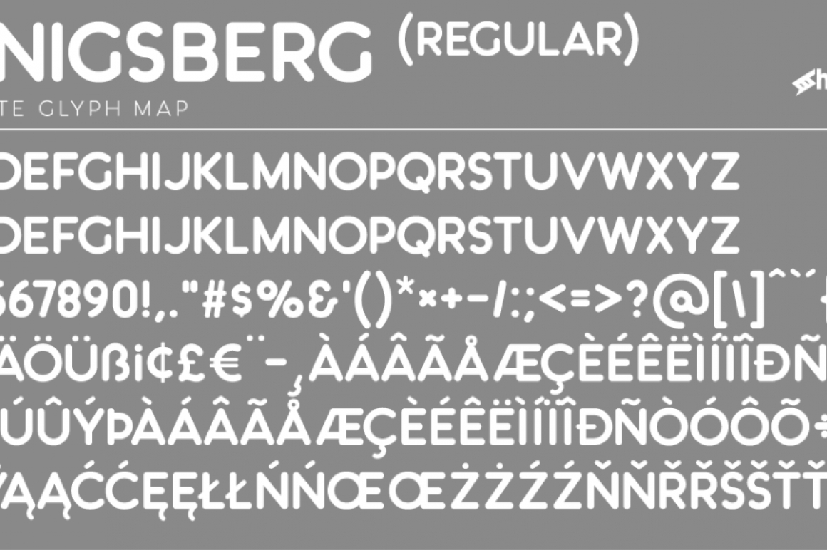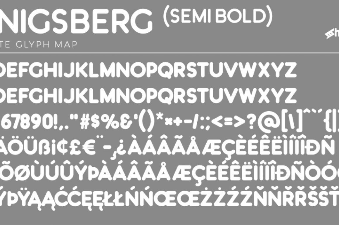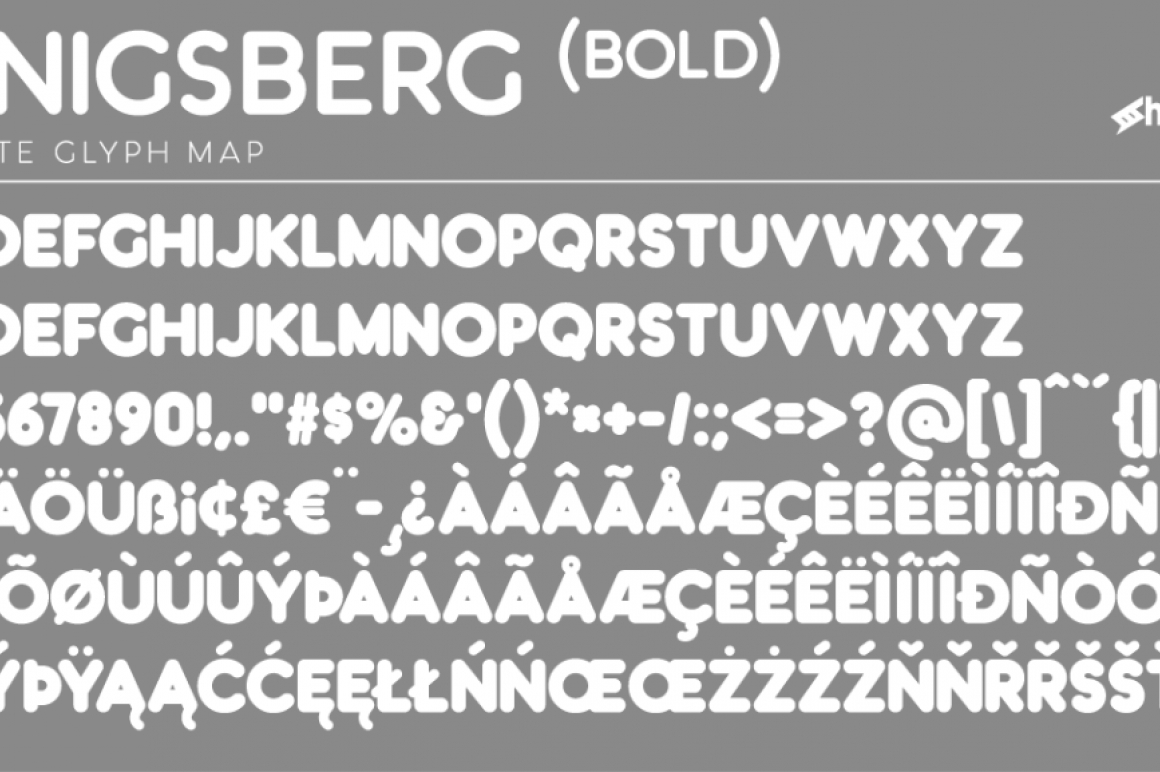 Königsberg is a fun and clean display font with 5 different weights for many different uses. It's softend style captures the feel of classic doughnut shops and children's books of the 70's. This rounded sans serif features matching uppercase and lowercase characters with the exception of Light and