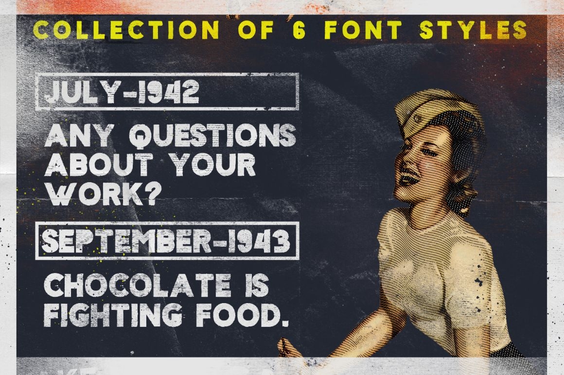 Font has 6 styles and it is ideal for retro and vintage projects, from clear designs to rough look designs.