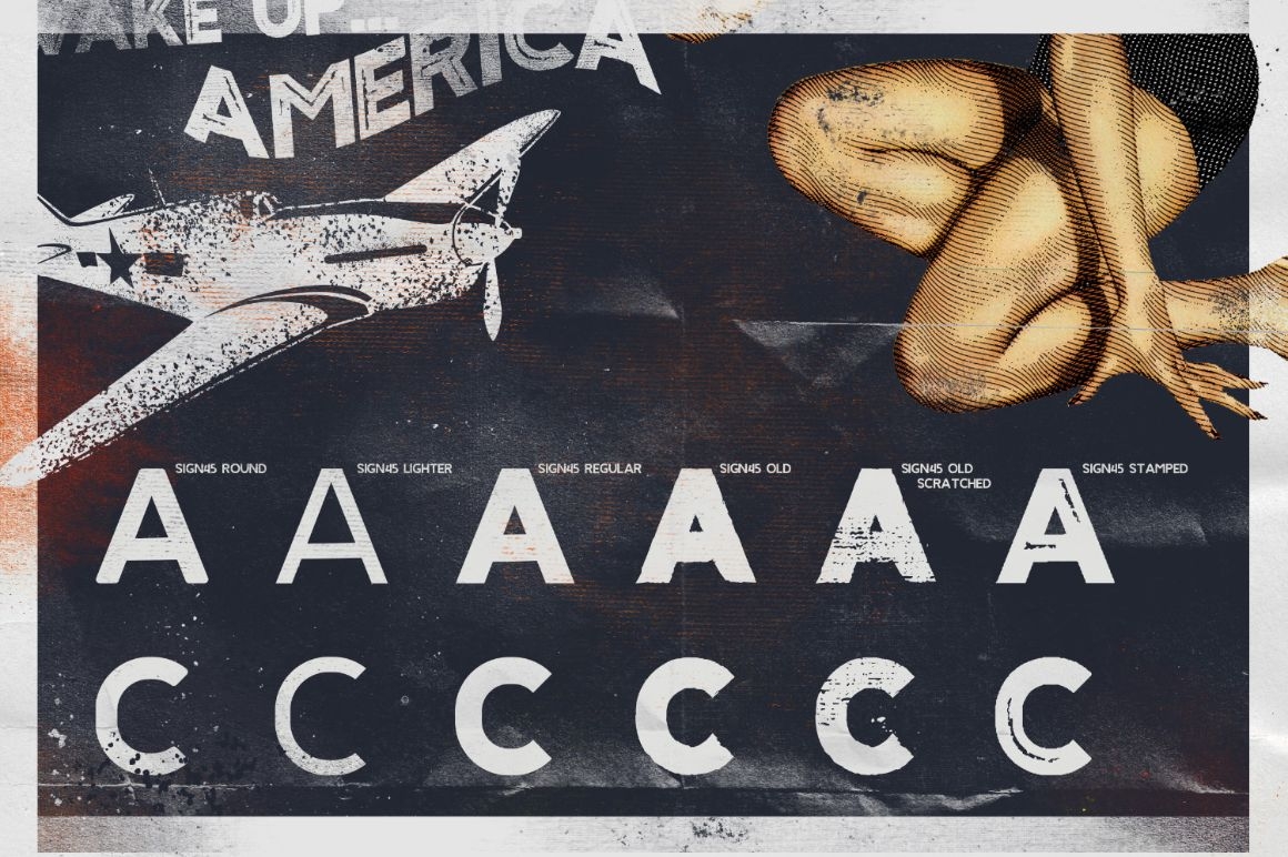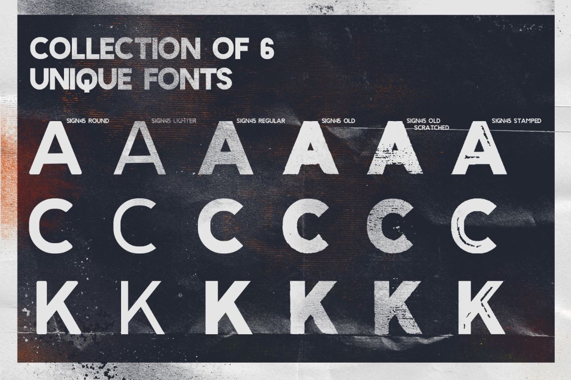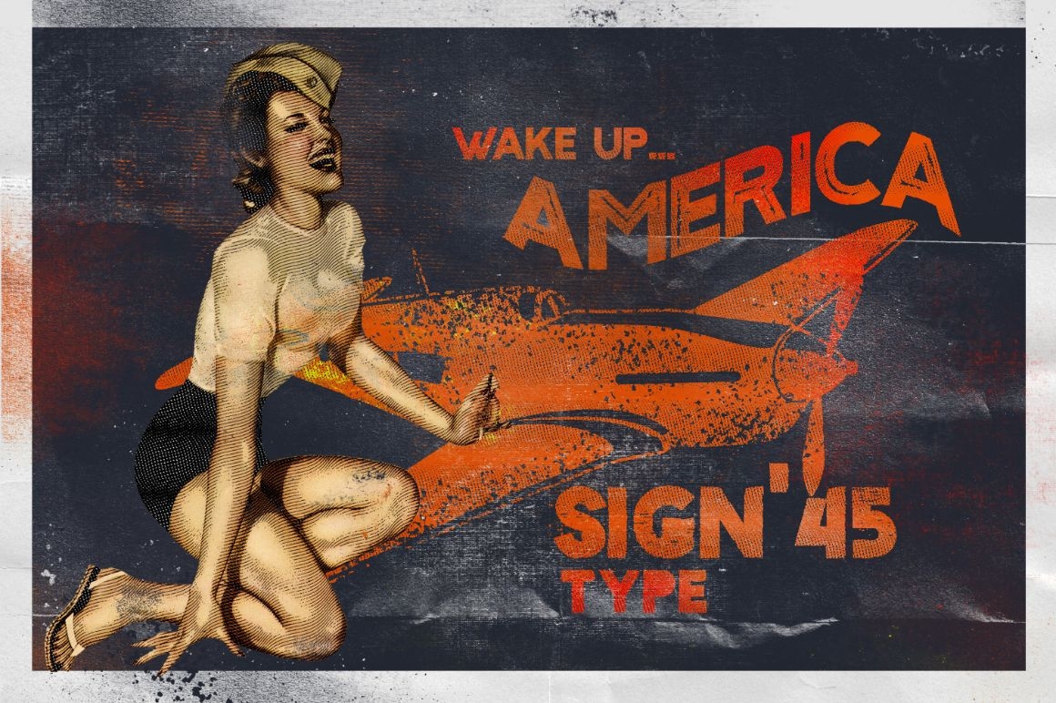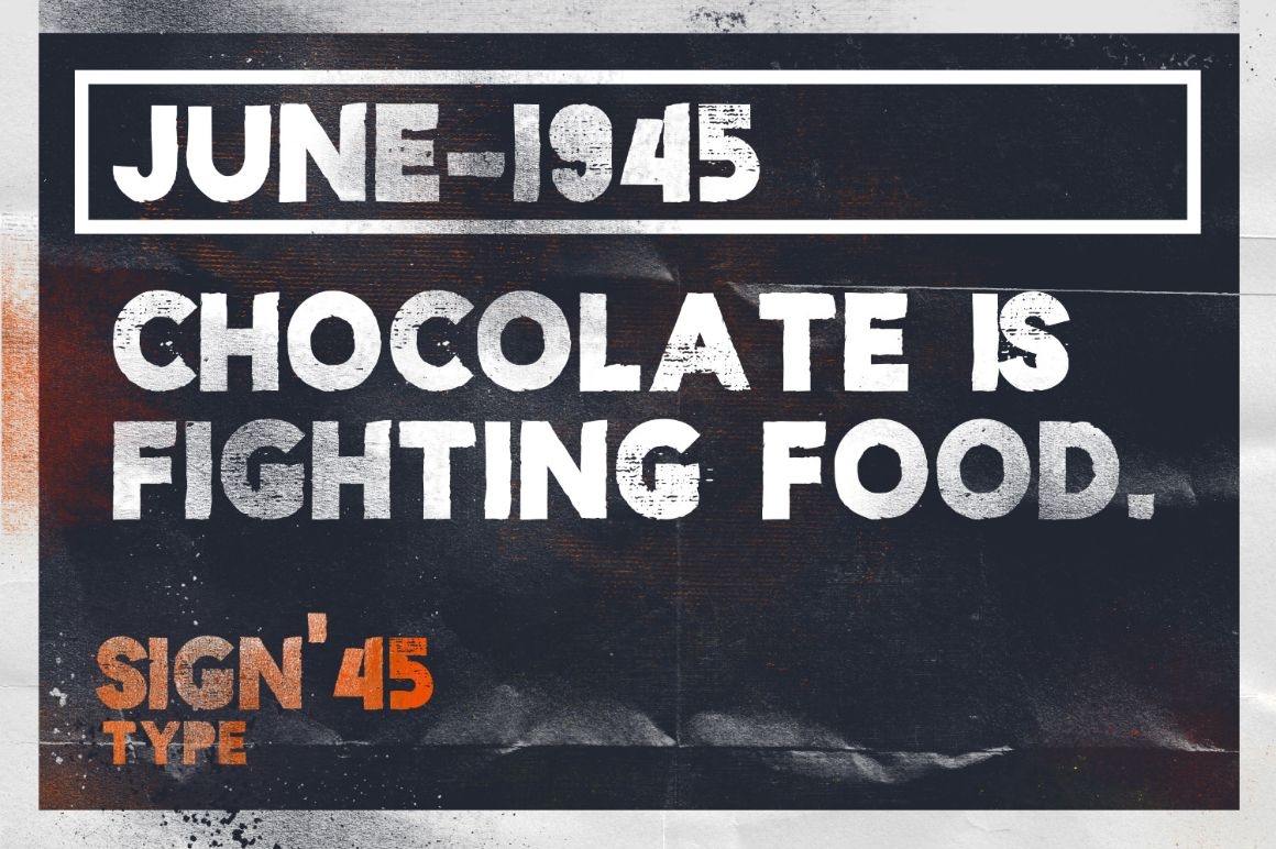 With Sign '45 Typeface you can make it easier to convey the message in your design. Use for awesome display, labeling, clothing, movie sceen, poster, movie title, gigs, album covers, logos, and much more.