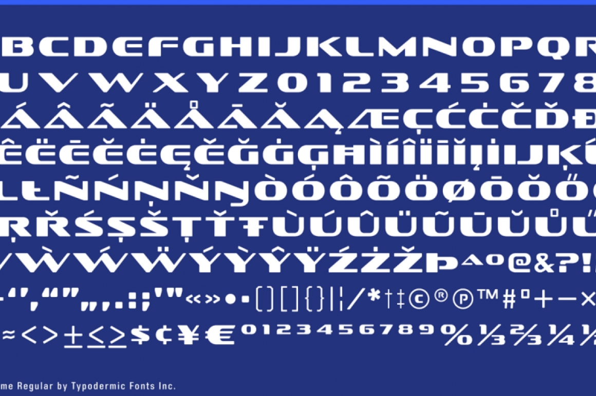 Sofachrome is an ultramodern, outspread headliner. Industrial curves provoke an atmosphere of sturdy plastic and metal while thick and thin stroke contrast makes a forceful impression. Sofachrome is available in 5 streamlined weights and italics.