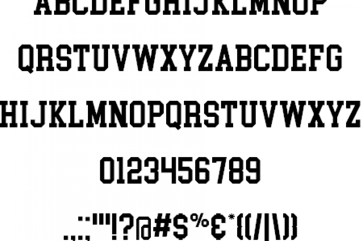 WAKE UP!! Class is in session! College Block is a modified version of Blockletter Tall featuring many new glyphs and of course serifs reminiscent of that used on collegiate sweatshirts. Kerning and European accents are included. Use it for your own tees or campus project.